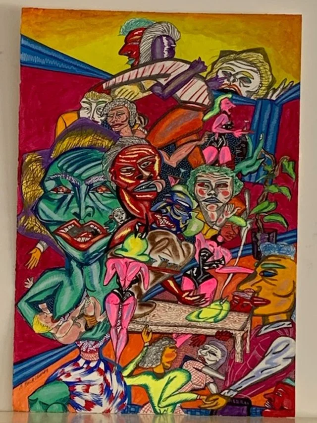 Ann Frick Vernon’s The Poet and the Playgirl began in the 70s as a suite of 10 drawings. In the 80s or 90s, she returned to the same theme in 6 large paintings, all acrylics on canvas. Together, these drawings and paintings portray the tumult of the familial and professional lives of a painter and her writer husband, each trying to work in the chaos around them. They are also wild and hyper-kinetic reports on the life of a woman artist. The 10 drawings and the first 4 of the paintings are in the permanent collection of the Manetti Shrem Museum on the campus of the University of California at Davis, and are available for loan to galleries, museums, and other art centers.